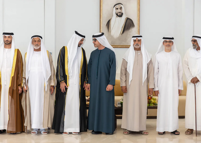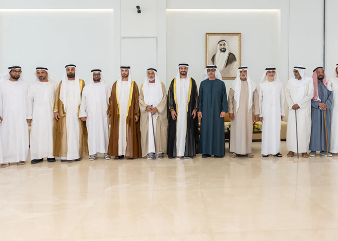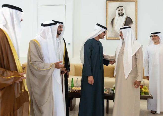 حضر سمو الشيخ هزاع بن زايد آل نهيان، ممثل الحاكم في منطقة العين، حفل استقبال أقامه اللواء الركن بحري حميد محمد بالعاجر الرميثي، قائد القوات البحرية، بمناسبة زفاف نجله "علي" إلى كريمة أحمد مطر محمد الرميثي.