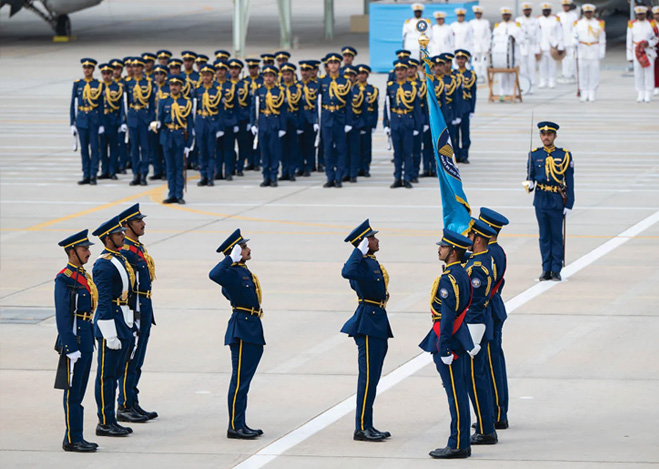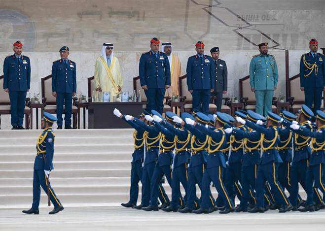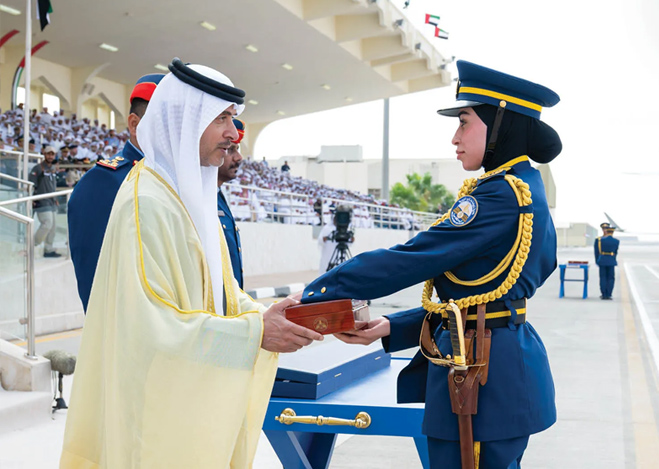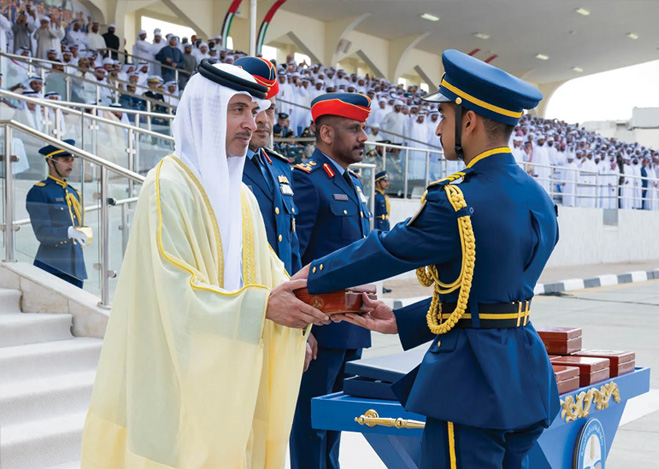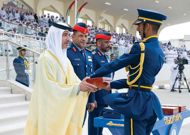 His Highness Sheikh Hazza bin Zayed Al Nahyan, Ruler’s Representative in Al Ain Region, has attended the graduation ceremony of the 55th cohort of cadet pilot officers and the 15th cohort of female cadet pilot officers at Khalifa bin Zayed Air College, as well as course 1 graduates from Zayed Military University.