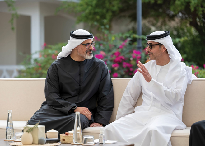 Hazza bin Zayed receives Khaled bin Mohamed bin Zayed at Al Maqam Palace in Al Ain Region
