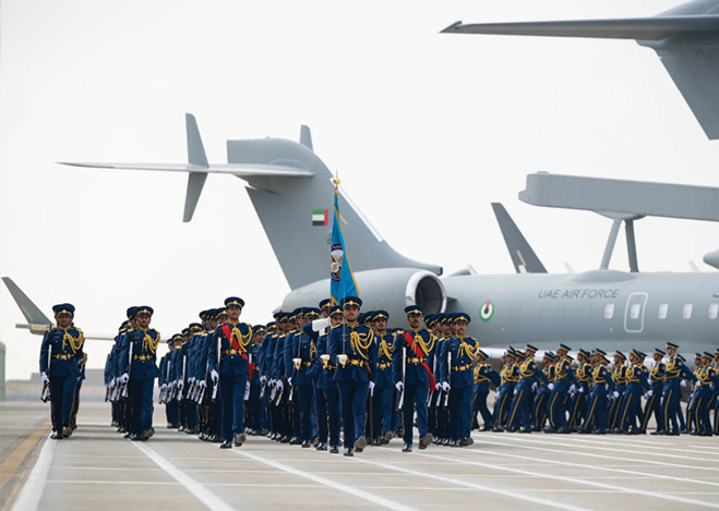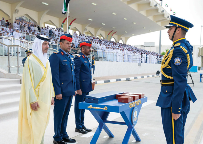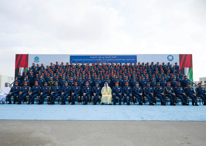 His Highness Sheikh Hazza bin Zayed Al Nahyan, Ruler’s Representative in Al Ain Region, has attended the graduation ceremony of the 55th cohort of cadet pilot officers and the 15th cohort of female cadet pilot officers at Khalifa bin Zayed Air College, as well as course 1 graduates from Zayed Military University.
