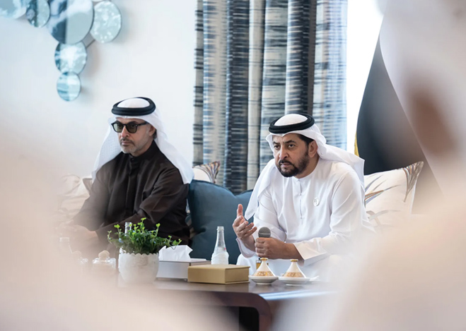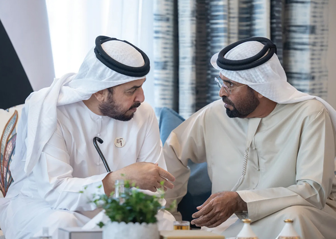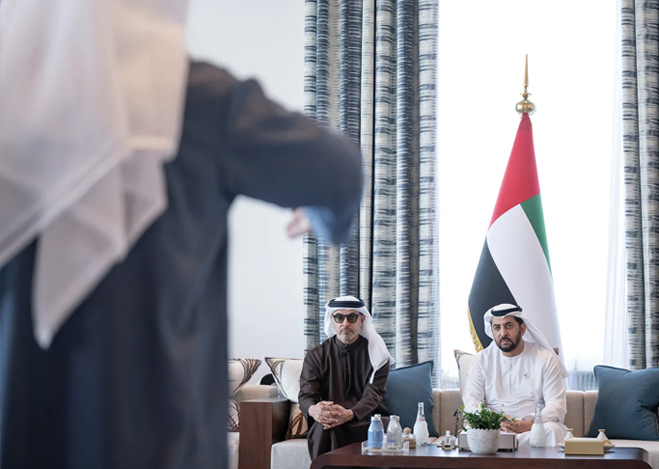 His Highness Sheikh Hamdan bin Zayed Al Nahyan, Ruler’s Representative in Al Dhafra Region, has received His Highness Sheikh Hazza bin Zayed Al Nahyan, Ruler’s Representative in Al Ain Region, in Barzat Al Dhanna Palace, Al Dhafra Region. Their Highnesses discussed the UAE’s ongoing sustainable development, reviewed key milestones in social and service sectors, and explored further initiatives to support stability and quality of life.